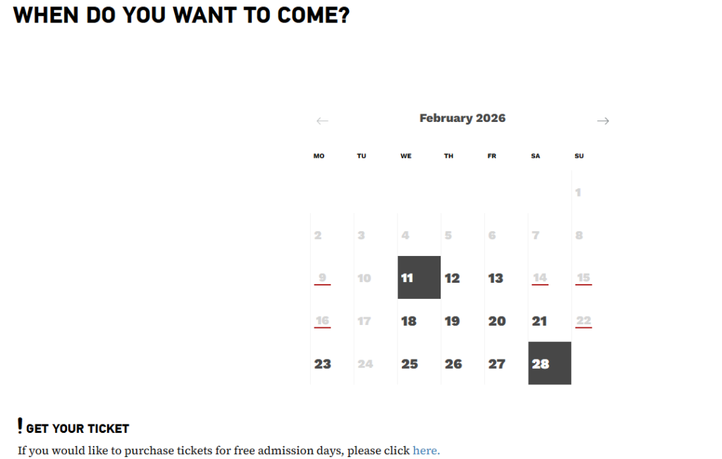 ▲「!GET YOUR TICKET If you would like to purchase ticket for free admission days,・・・」と記載のあるものは終日入場無料日(4月18日、5月18日、10月12日、12月6日祝日的な日)のことです。